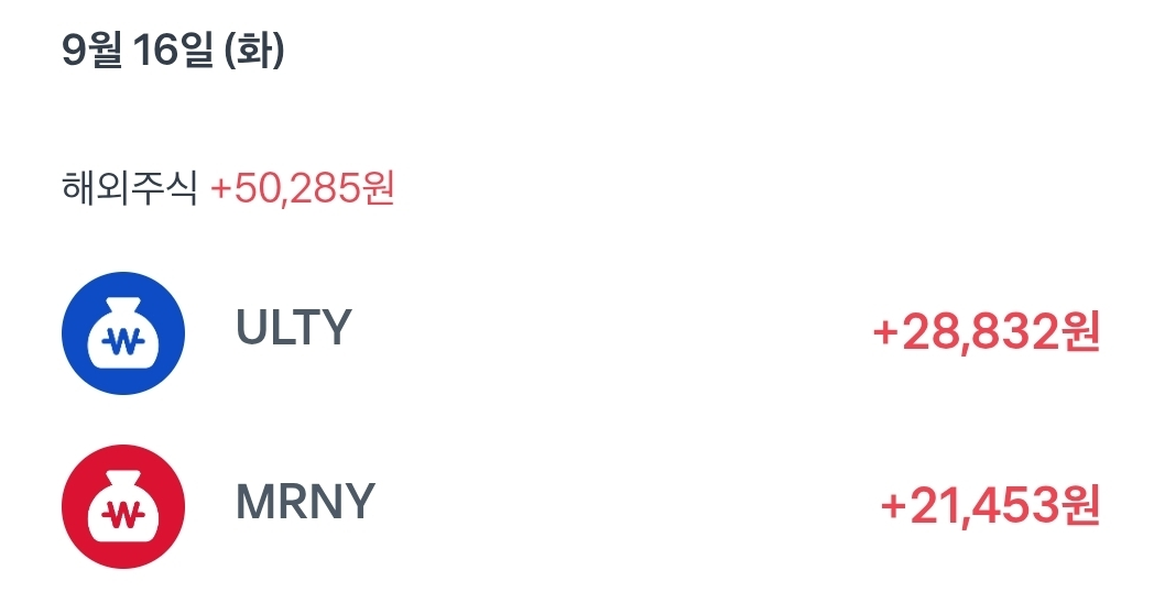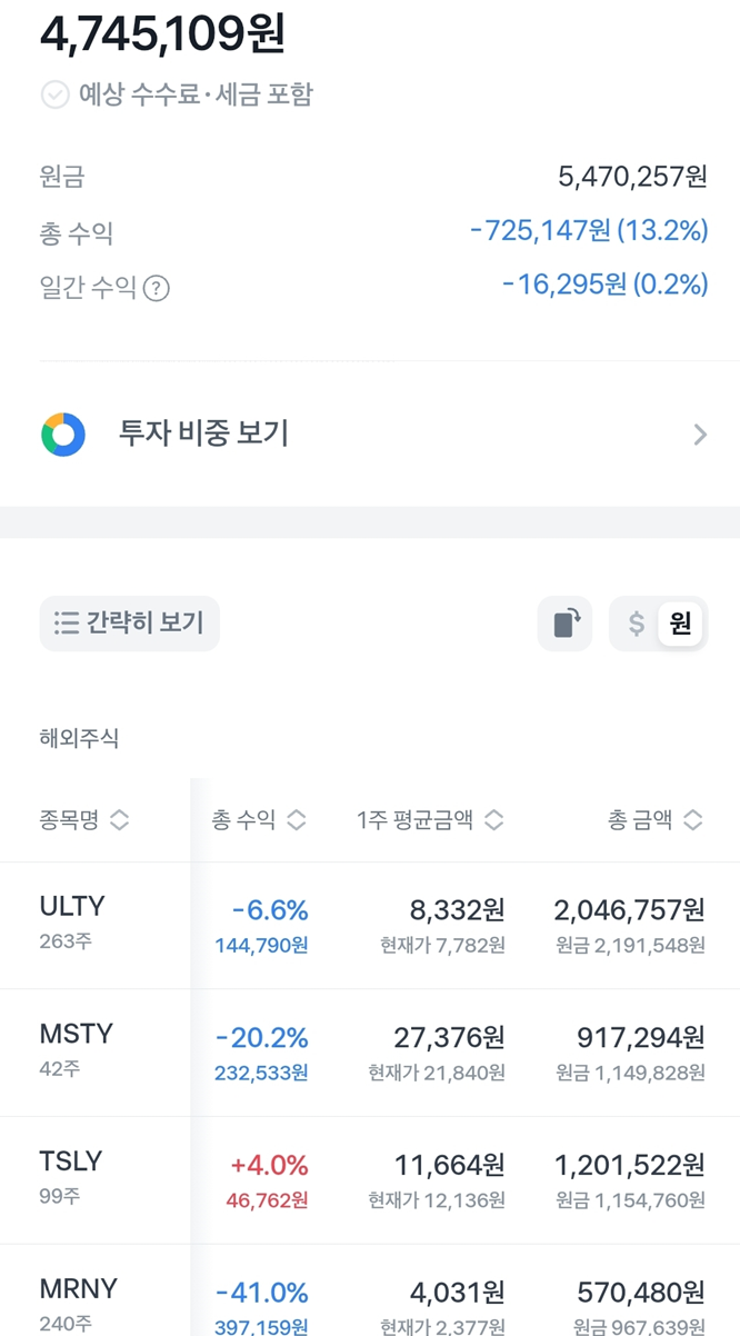 종목 수량 배당금(세전) 세금 배당금(세후) 배당락일 ULTY 263주 33,917원 5,085원 28,832원 9월 11일 MRNY 240주 25,246원 3,793원 21,453원 9월 11일 합계 - 59,163원 8,878원 50,285원 - 3. 현재 계좌 상황 및 수익율
